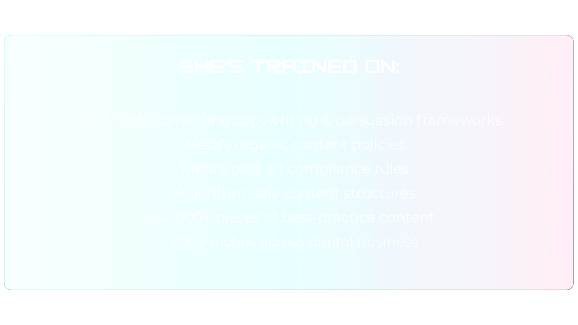 She’s pre-loaded with high-converting content frameworks, trained on millions of data points, and powered by a feedback loop that makes her smarter with every post.